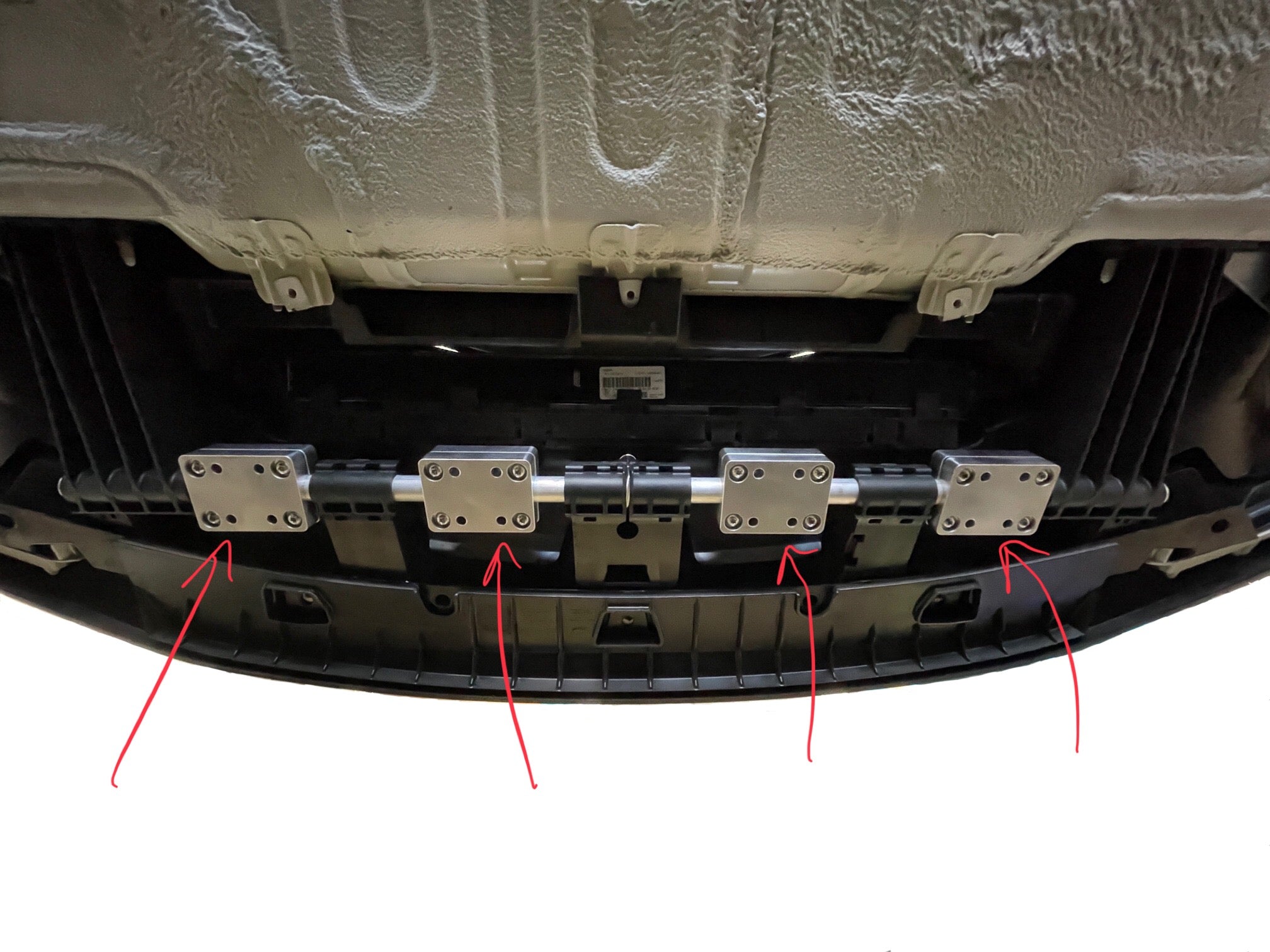 Using (4) M6x30 screws, attach the bracket sets in each of the bottom 4 locations. Before tightening these clamps, Use a leveler to make sure they are all flat and roughly centered on the aluminum rod. For the first fitment it may take a little bit of back and forth with the splitter to make sure all the holes line up properly but there is a decent amount of room for error. Once these brackets are in their proper positions, tighten the screws.