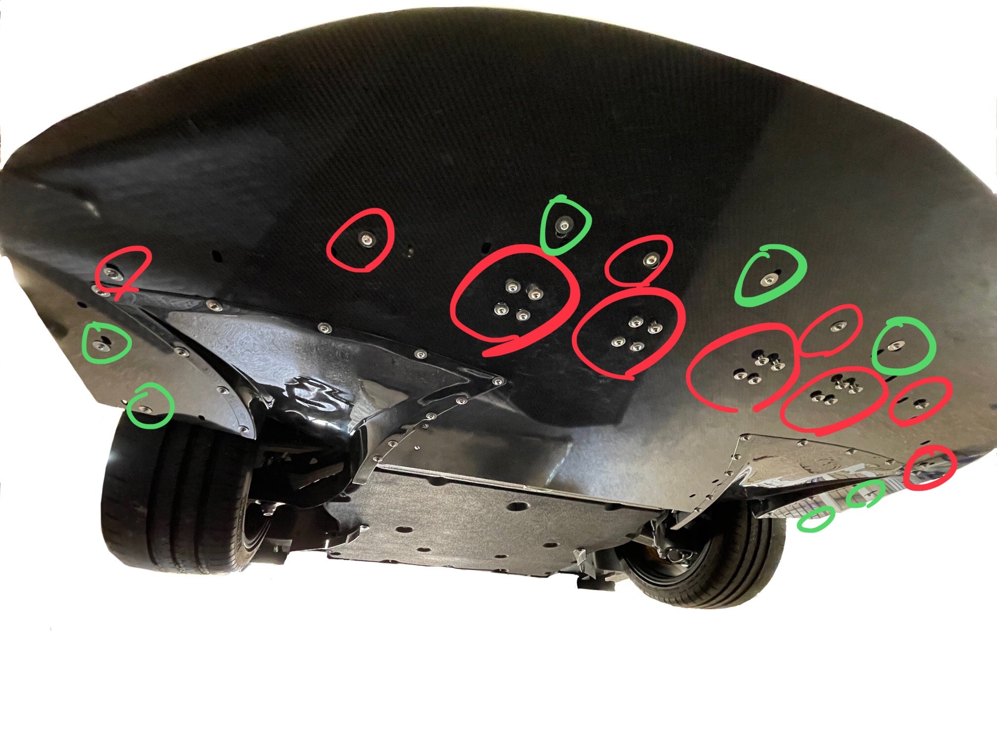Once the brackets are secured, and in the right position, it is time to install the splitter onto the car. Start by lifting the splitter into place and using a couple of M6x25 screws to hold the splitter up. There are (4) screws for each main bracket for a total of (16) screws. For each screw use one of the oversized washers. Like all installations, it is recommended to not tighten down all screws until the all of the screws are in position. Once the splitter is held up by a few screws, it is time to install the rest of the fasteners on the main brackets. Next, the positions circled in green require a #8 x 1.5" screw. The #8 x 1.5" screws use a T20 Torx bit. Finally, use (6) M6x40 screws in the other 6 locations highlighted in red that are not part of the main mounting bracket holes. There should be some play in the position of the splitter since the screw holes are all slots. Position the splitter as desired and tighten down all of the screws. The further the splitter extends outwards, the more downforce will be generated in the front.