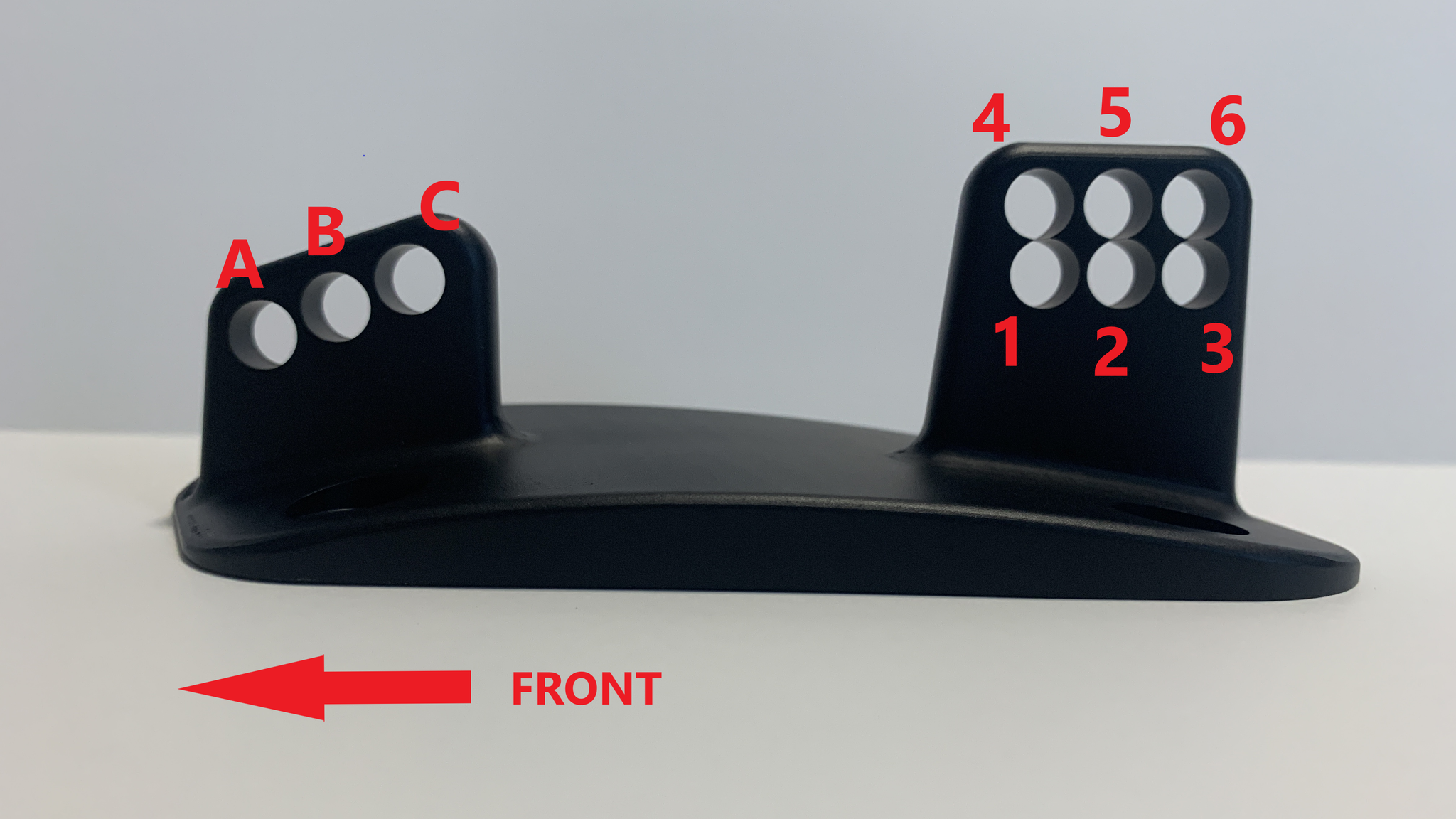 The DBJ 1450mm wing has a total of (6) Angle of attack settings. In the picture above, each hole is labeled in red with a number or letter. These are the combinations and corresponding AOAs: