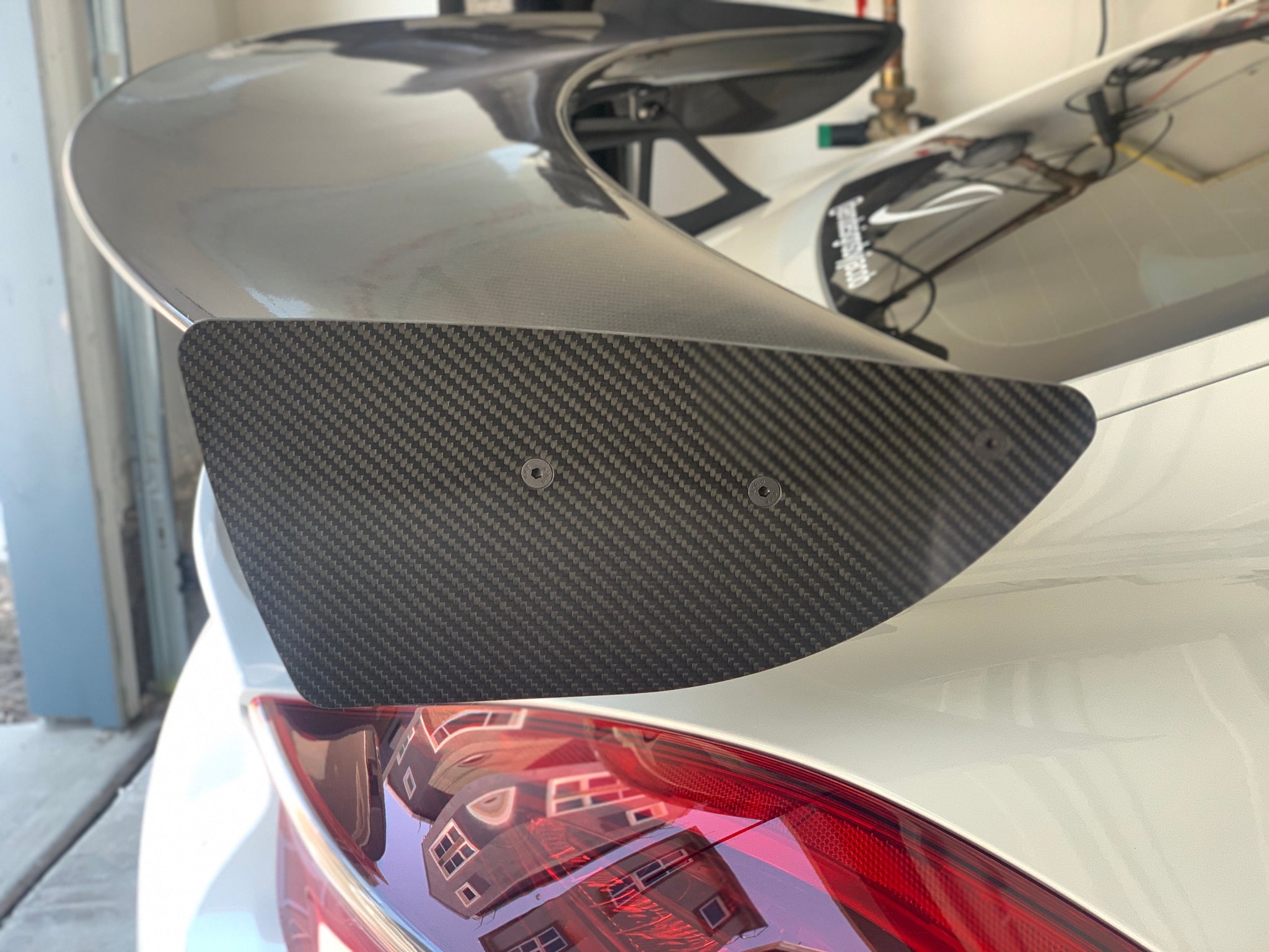 Remove the OEM wing using (2) T30 Torx sockets. One socket will be required on each side. There are (2) screws on each wing stand for a total of (4) screws that hold the wing to the risers. Be careful not to let the OEM wing drop onto your car when removing the screws. Set the original hardware aside as we will reuse them for the DBJ 1450mm wing.