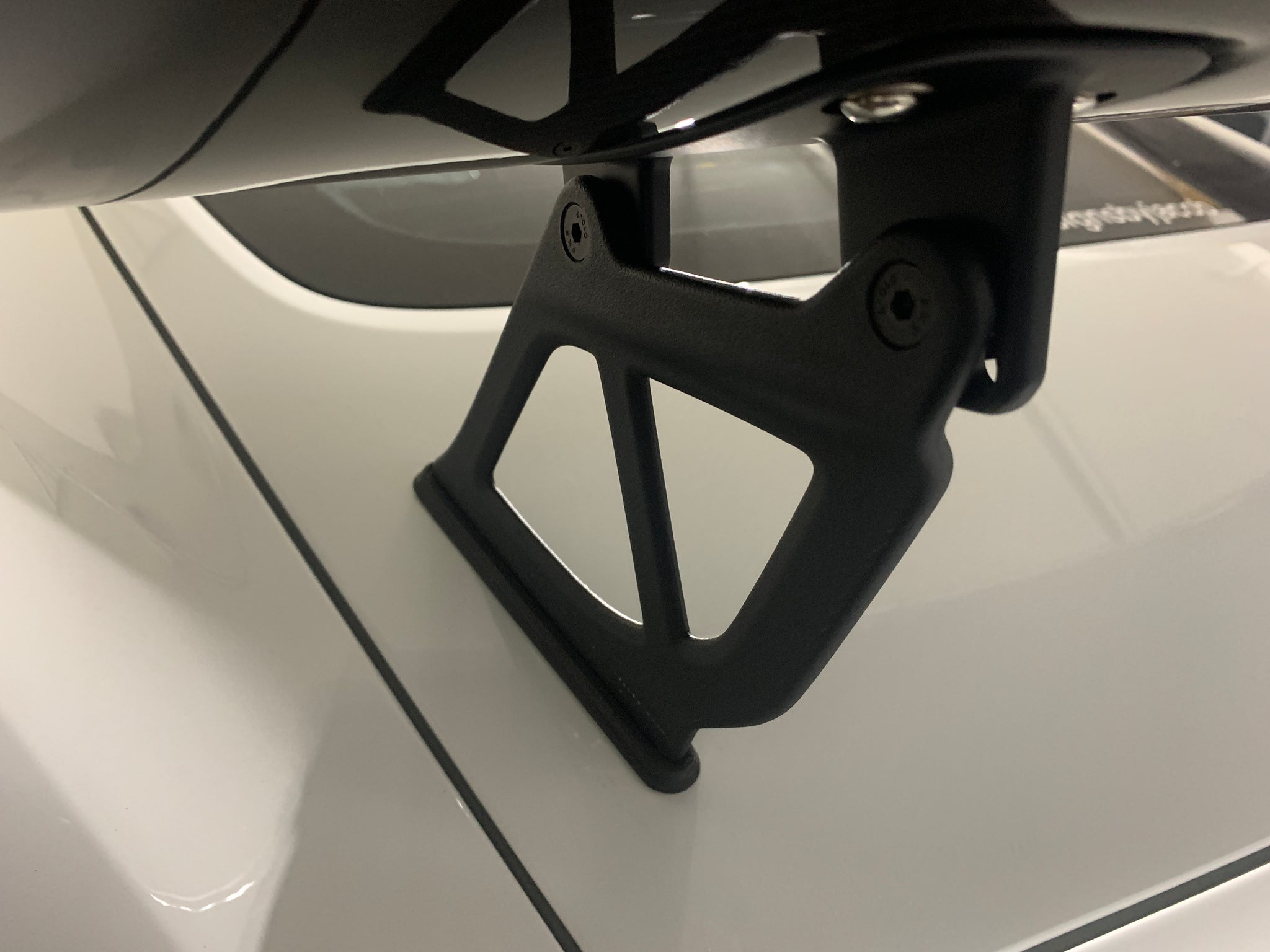 Attach the (2) wing mounts onto the underside of the wing using a 4mm allen socket. Align the mounts as seen in the photos below. Use the supplied (8) M6x20mm screws. When attaching the wing mounts onto the wing for the first time, the threads maybe tight so be careful to line everything up straight and go slowly. Torque these screws down to 35in*lbs (NOT ft*lbs).