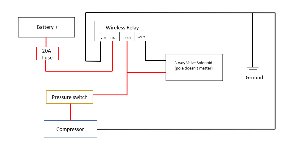 Follow the electrical diagram to the left to wire up your lift kit. Use crimps to secure the spade terminals and ring terminals to the wires. Once the wiring is completed, the wireless relay can be attached to the compressor mounting bracket via zip ties. Use two of the holes circled in red in the right most picture above.
