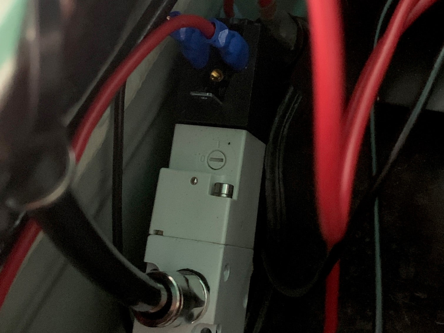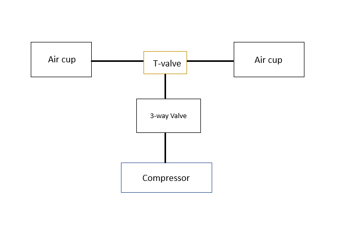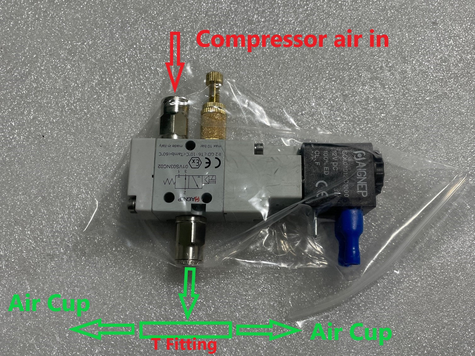 The picture to the left illustrates the hosing setup for the 3way valve. The top side is where the compressor line enters, and the bottom is where the hosing should leave and enter the T fitting. From there, the air hoses will connect to the aircups.