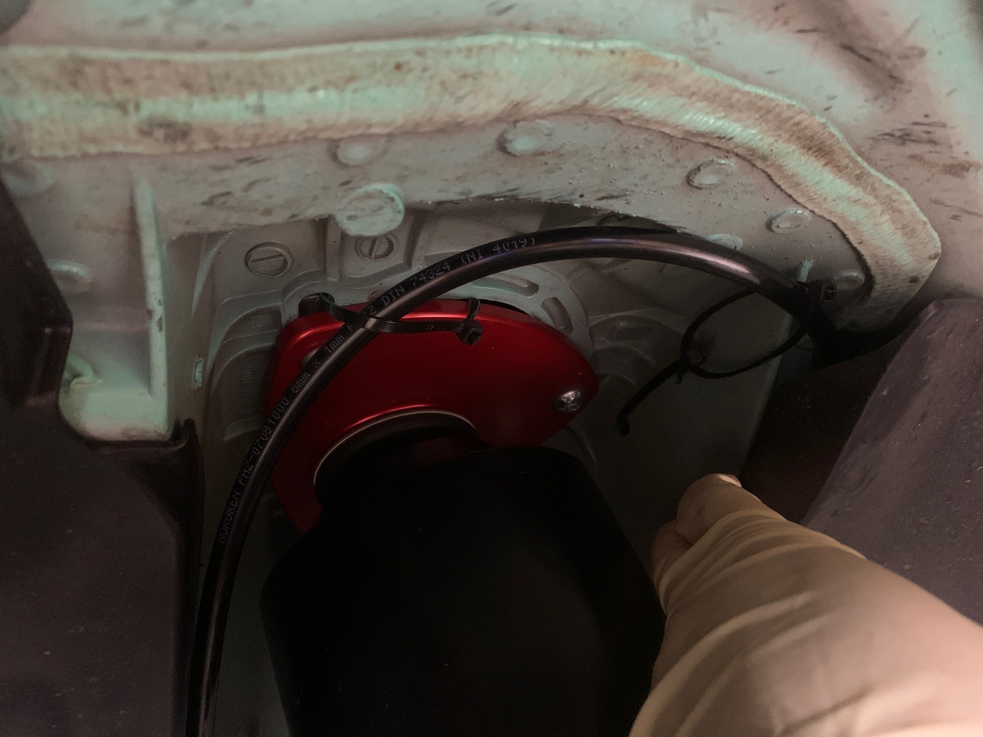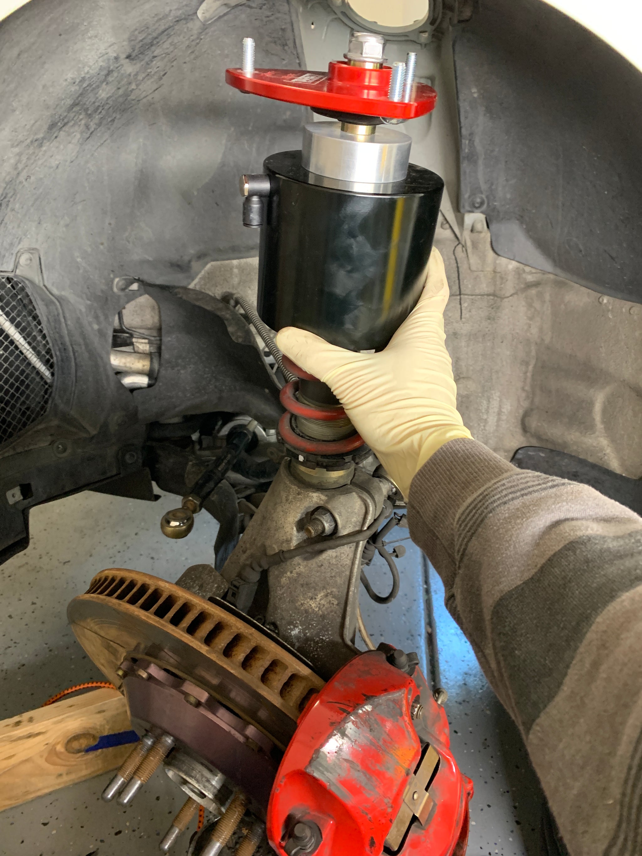 5. Slide the air cup over the springs and strut. The inside should receive the spring nicely. We found the best routing position for the air hosing is by facing the inlet towards the front of the car. There is a path for the pressure hose to go into the battery area without drilling or even removing fender lining.