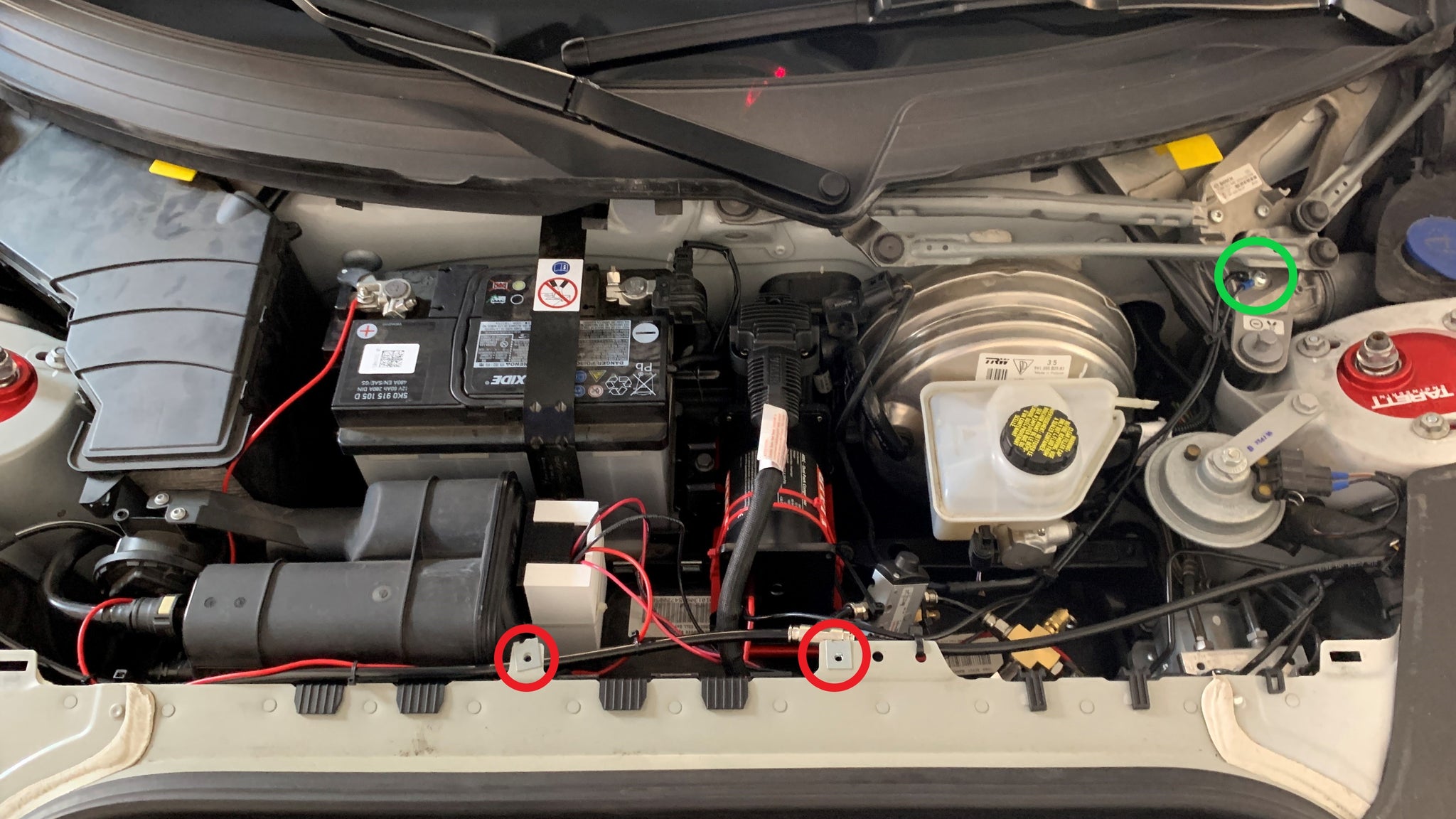 Once everything is hooked up properly, we recommend using supplied zip ties to secure the wires and hoses to the chassis. Make sure the hose does not contact the tire or crimp when driving and during turns. Ensure that wires are not excessively bent and not contacting metal surfaces. Check to see that the pressure switch and 3-way valve are also securely restrained to the sides. Reinstall the front cowl and wheels. Take your car out for a test drive and enjoy the lift kit!