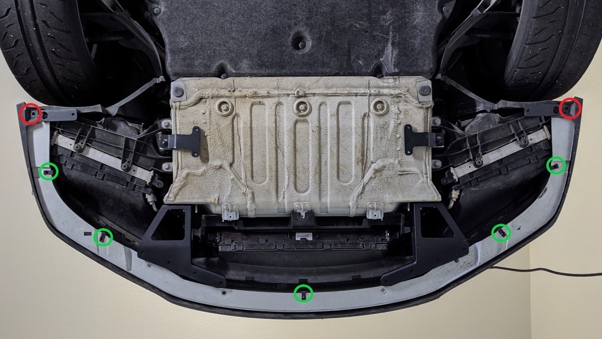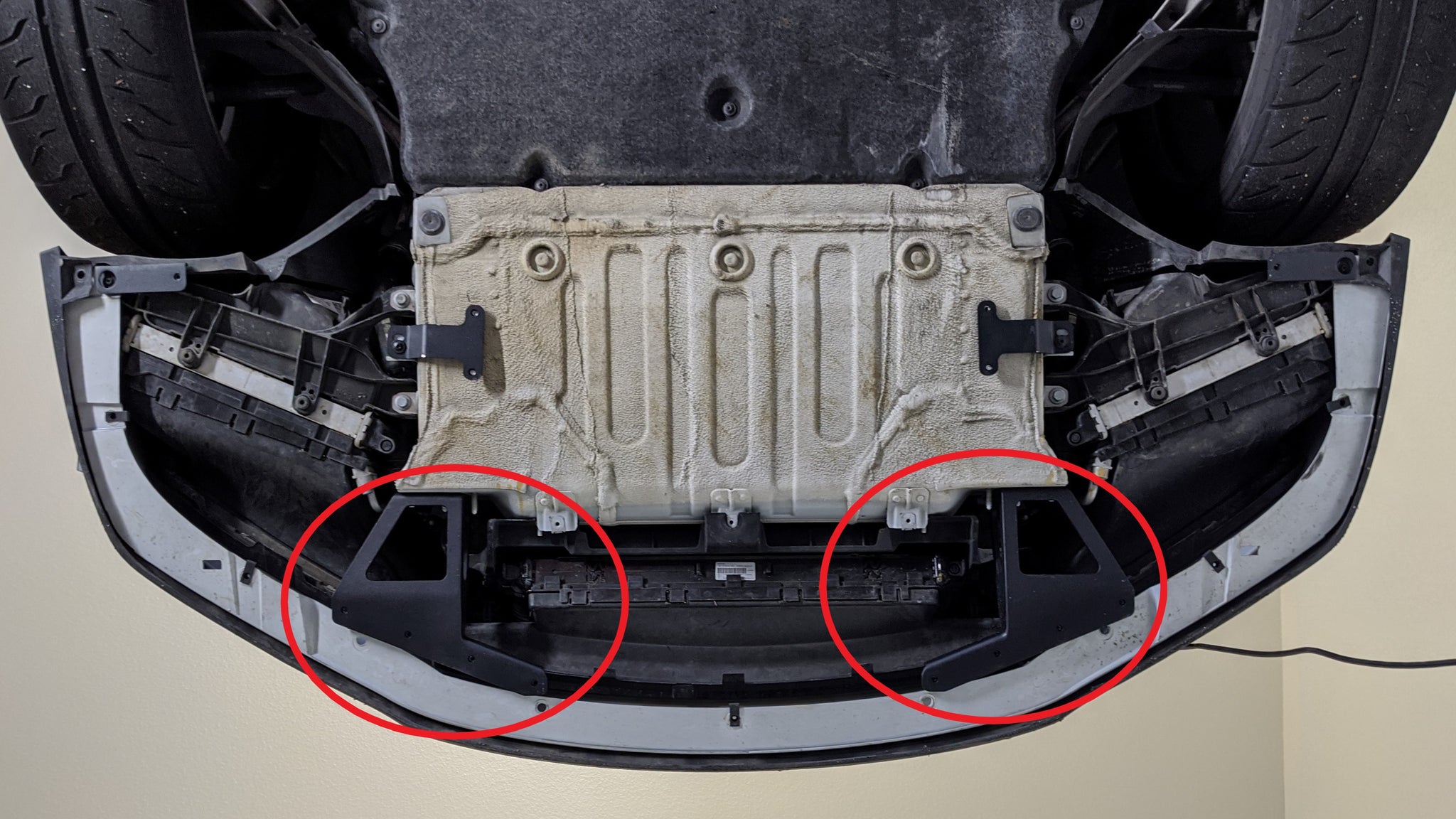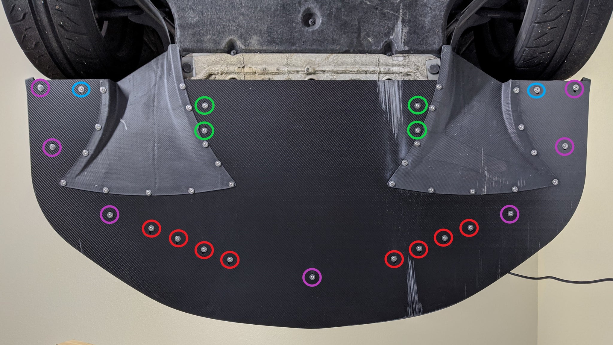 Now we are ready to install the front splitter. Lift the assembled splitter up and onto the car. Try to line up (1) M6x25 screw and (1) M6 washer on each main bracket before adding more screws. Using the photo above, you can determine what size screw to use for which hole. The (4) green circles use M6x12 screws. The (2) blue circles use M6x15 screws. The (8) red circles use M6x25 screws. The (7) pink circles use M6x40 screws. For all screws, make sure to use an M6 washer. Install all screws by hand first. Slide the splitter around to ensure the best fitment and positioning before tightening all screws using a 4mm allen bit. There is some room for the splitter to extend out further as all mounting holes are slots. Note: for all pink screws (M6x40) only tighten by hand. The clip nuts are mounted onto the bumper and will not bottom out. They can deform the bumper and are meant to just be tight enough to secure the air dam to the splitter.