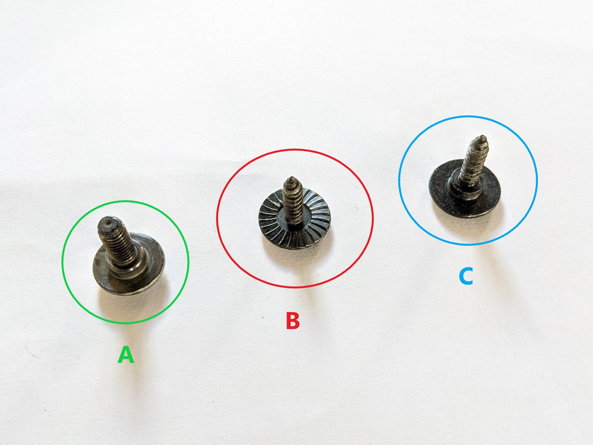 When installing the mounting brackets later, we will need to reuse (4) B screws (shown in red), and (2) C screws (shown in blue on the right.