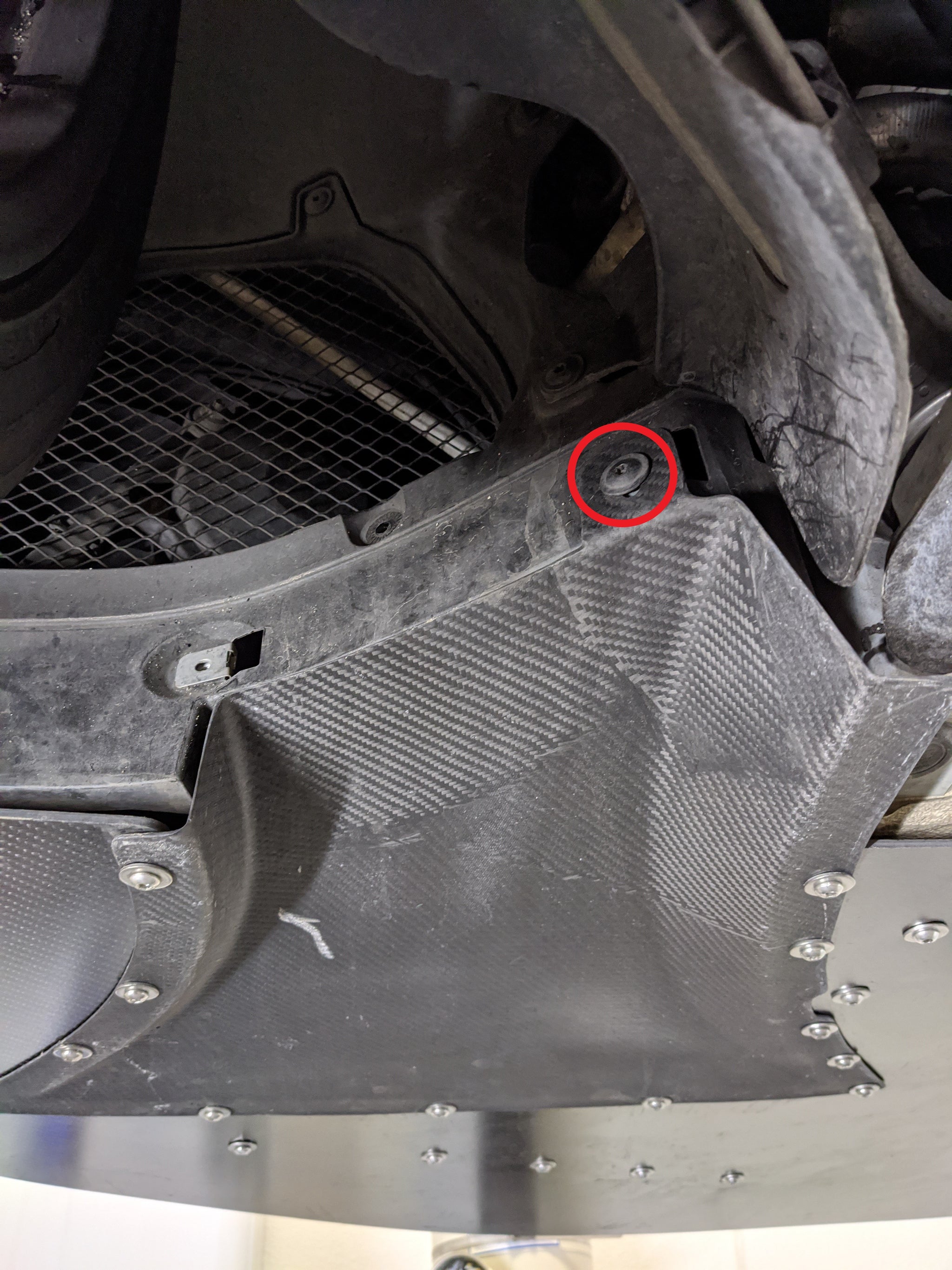 For each of the diffusers a tab extends upwards and should line up with a screw hole in the wheel well. Use (1) of the saved OEM "B" screws (see previous steps) for each diffuser. You will need a T25 Torx bit to install these. Do not over tighten these screws as you may damage the carbon fiber. The install is now complete!