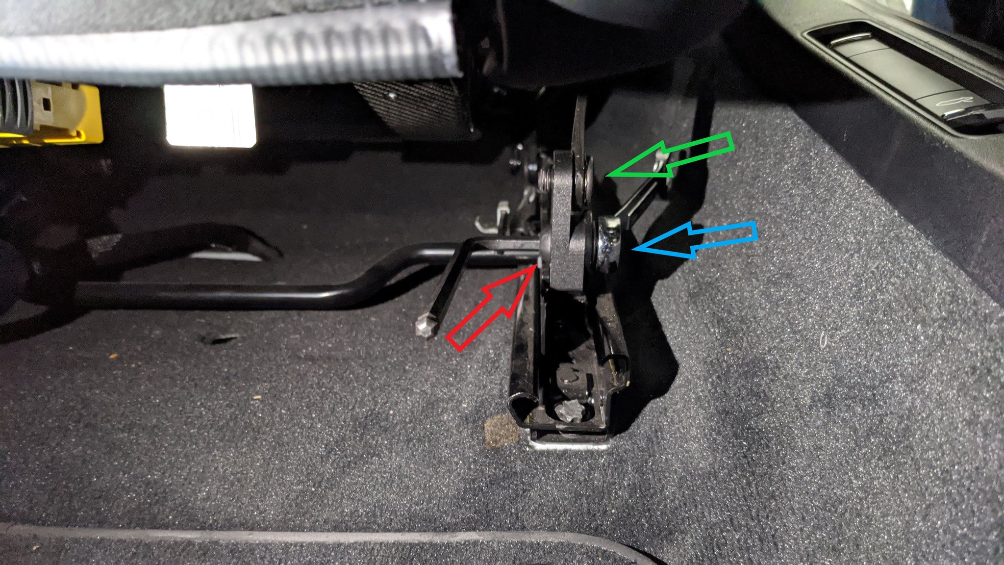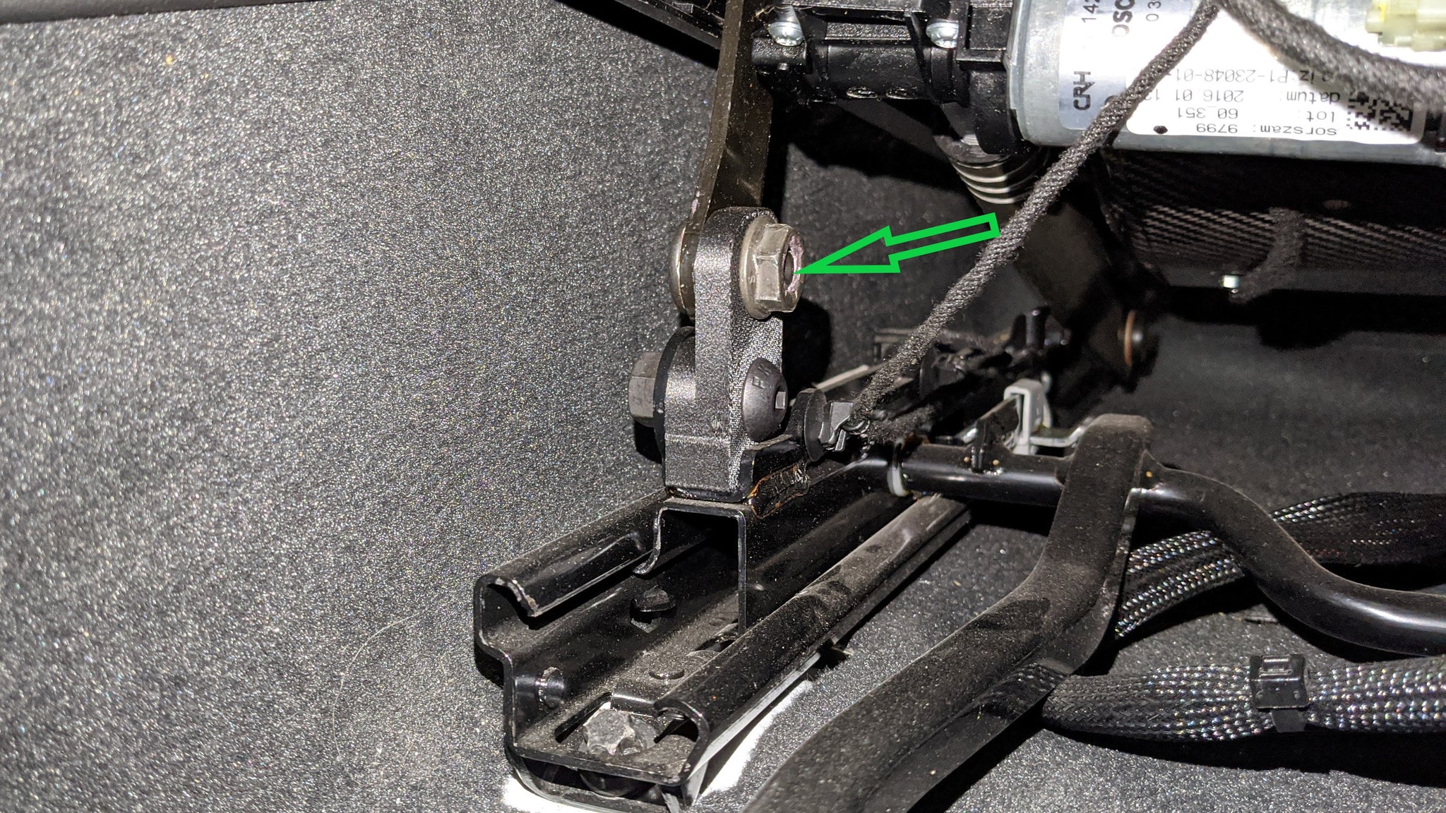 Finally put the OEM nut onto the OEM shoulder screw as shown in the right picture (green arrow). The shoulder screw may take some pressure to push through the OEM bracket enough for threads to catch the OEM nut. Double check the positioning of both recliner brackets when all fasteners are hand tight. They should fit in easily and the seat brackets should line up. Once both sides have been checked, torque down all the nuts and bolts.