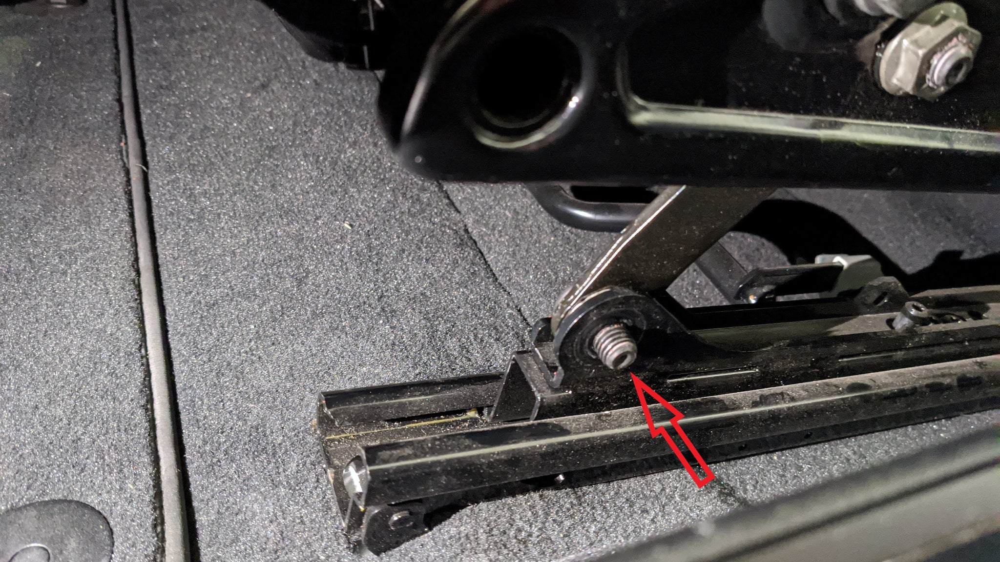 To remove the OEM shoulder screw, You may need to push or knock the bolt lightly with a hammer to loosen the shoulder. Another method is inserting the 8mm allen and pushing on the screw in the direction of the red arrow (right picture) while twisting left and right. Repeat these steps for the other side of the seat. Everything is identical just mirrored. Make sure to keep the OEM shoulder screws and nuts in a safe place. We will reuse them to secure the seats to the recliner bracket.