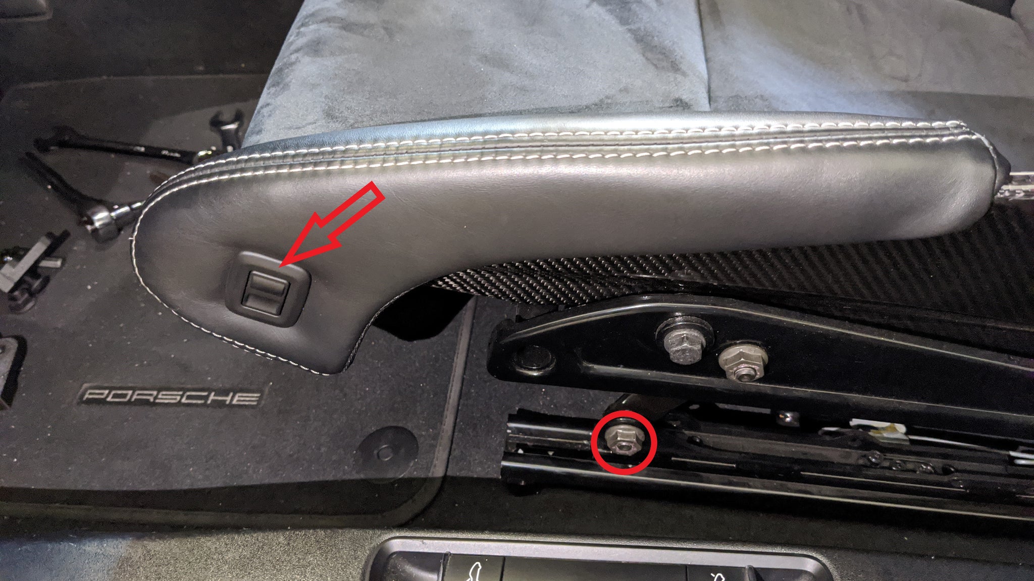 Start by raising up the seat as high as you can to give more clearance to access the bolts under the seat. This can be done by pushing the button pointed out by the red arrow in the picture to the left.